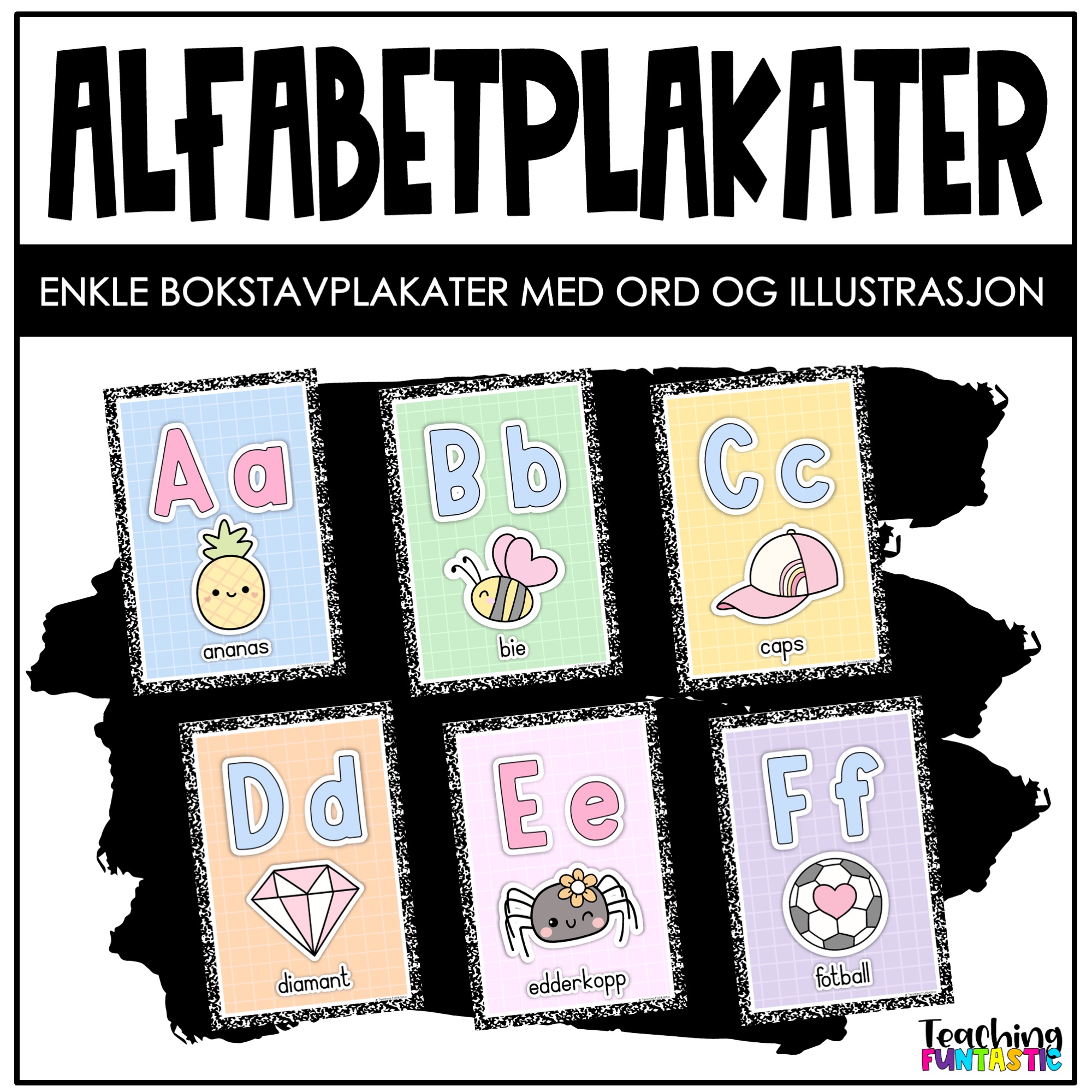 Hver plakat har en illustrasjon knyttet til bokstaven, sammen med ordet skrevet tydelig. Dette gir elevene muligheten til å koble bokstavlyden til et konkret bilde og ord, noe som styrker både bokstavinnlæringen og ordforrådet. Visuelle hjelpemidler som disse alfabetplakatene er spesielt nyttige for yngre elever, og bidrar til å gjøre læringsprosessen mer engasjerende og forståelig.