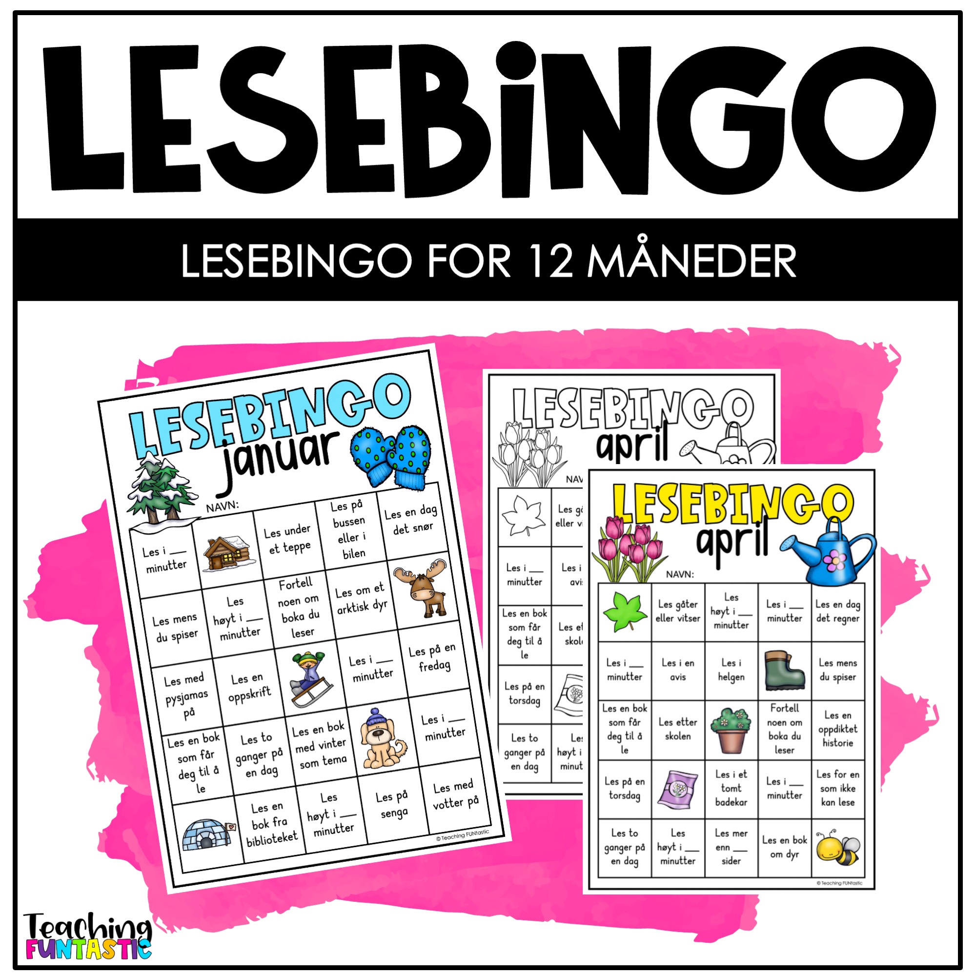 Lesebingo er en enkel og motiverende måte å få elevene til å lese mer på – og med disse månedlige Lesebingoene har du et ferdig opplegg klart for hele skoleåret. Her får du én Lesebingo for hver måned, tilpasset årstid, høytider og elevenes hverdag. Lesebingo gir variasjon i leselekse og gjør lesing til noe elevene gleder seg til. Oppgavene er enkle å forstå og gir rom for både humor, kreativitet og mestring, samtidig som elevene får viktig mengdetrening i lesing.
