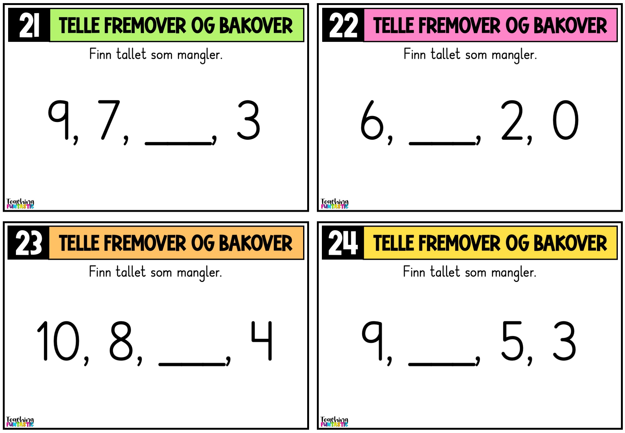 Dette settet med oppgavekort i matematikk gir elevene trening i å telle forlengs og baklengs til 10, med ulike startpunkter og ulik differanse. Det følger med fasit og svarark, slik at oppgavene raskt kan tas i bruk og elevene selv kan sjekke om de har kommet frem til riktige svar. Målet er at elevene skal kunne mestre læringsmålene i matematikk for 1. trinn ved bruk av oppgavekort som en av flere arbeidsmetoder.