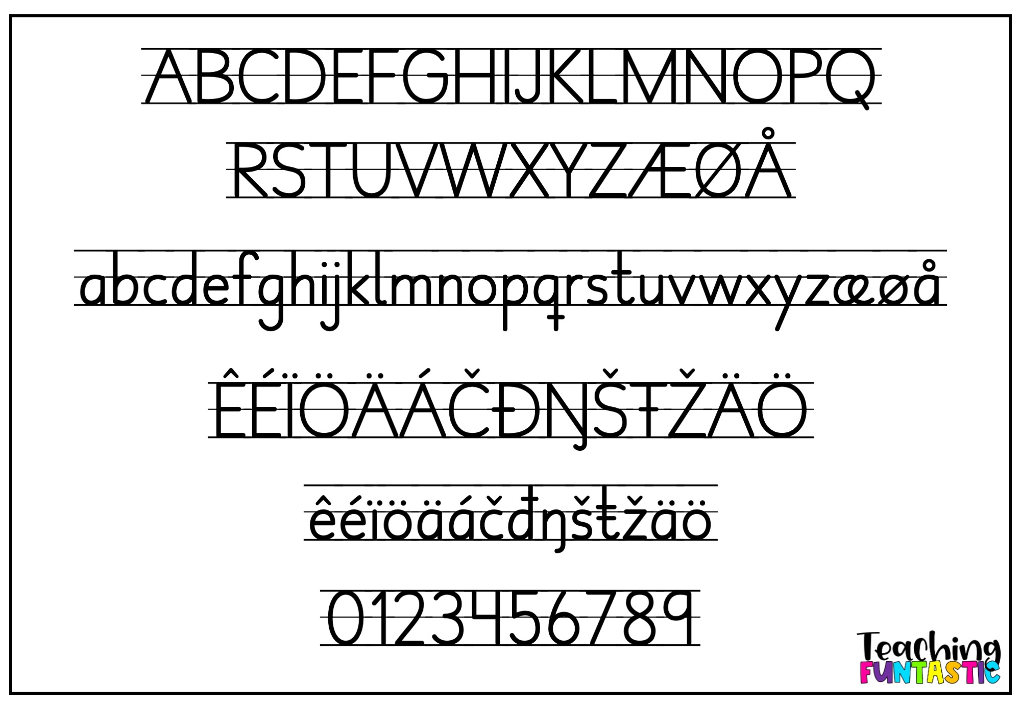 Funtastic Trykkskrift 1 – Bokstavhus er en linjert versjon av FUNtastic Trykkskrift 1, der bokstavene automatisk plasseres i et ferdig bokstavhus med hjelpelinjer. Perfekt til oppgaveark, skriveøvinger og bokstavforming i begynneropplæringen!