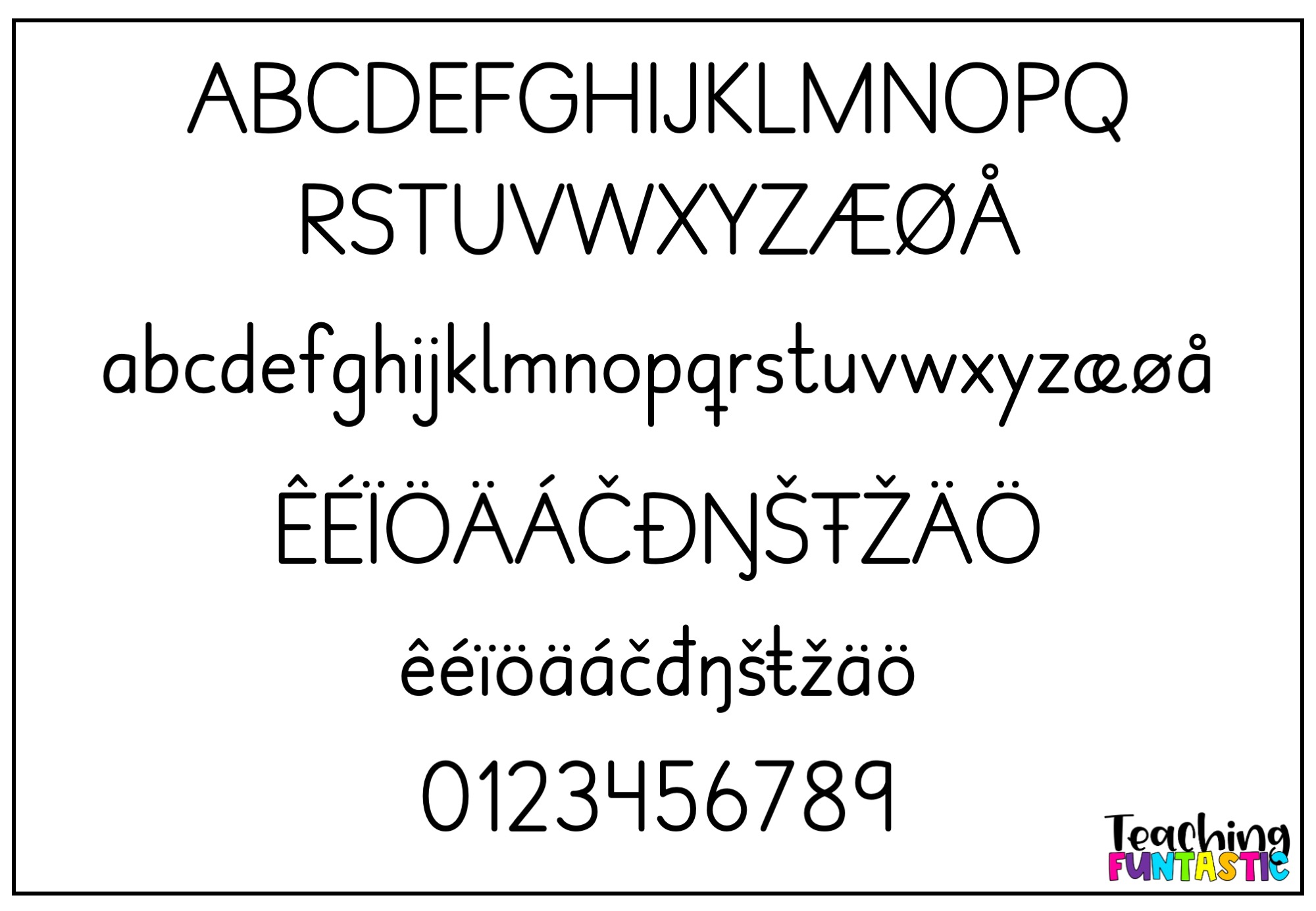 FUNtastic Trykkskrift er en font med alle de norske og samiske bokstavene, slik at du slipper kompromisser i norskspråklig undervisningsmateriell. Bokstavene har balansert høyde og avstand for best mulig lesbarhet, både på skjerm og utskrift, slik at den fremstår klar og leselig uansett størrelse.